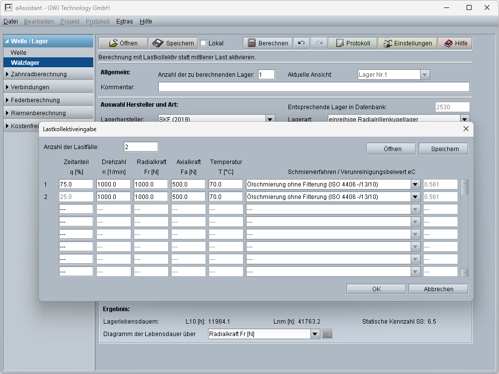 Eine Berechnung mit Lastkollektiven ist ebenfalls möglich. Hierfür kann eine beliebige Anzahl von Lastfällen definiert werden. Für jeden einzelnen Lastfall ist die Vorgabe von Zeitanteil, der Radial- und Axialkraft, der Temperatur und der Sauberkeit möglich. Lastkollektve können unabhängig von der zugrundeliegenden Lagerberechnung gespeichert und geladen werden.