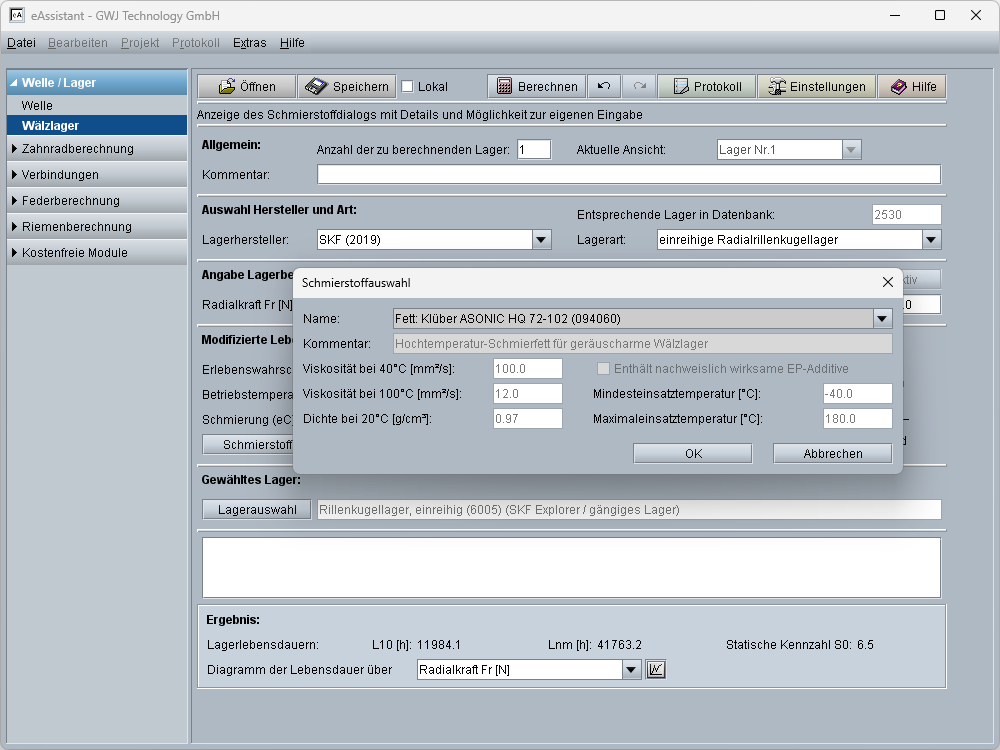 Weiterhin können für die Berechnung der erweiterten Lebensdauer verschiedene Öle und Fette aus einer Datenbank gewählt oder selbst angegeben werden. In der integrierten Schmierstoffdatenbank stehen Produkte der Firmen Lubricant Consult, Fuchs Lubritech, Aral und BP zur Auswahl. Zusätzlich werden die Vorgaben für die Erlebenswahrscheinlichkeit, die Betriebstemperatur und die Sauberkeit unter Betriebsbedingungen in der Berechnung berücksichtigt.