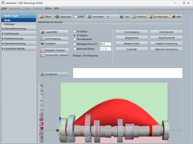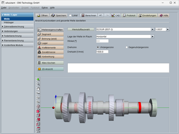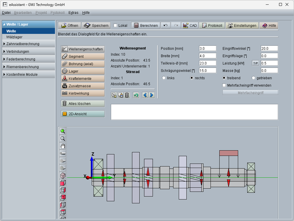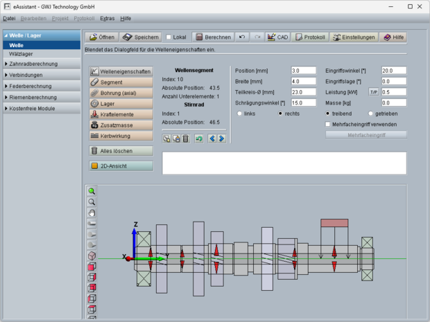 Neben der direkten Eingabe von Kräften und Momenten in den Koordinatenrichtungen können auch intelligente Kraftangriffselemente, wie Zahnräder, Zusatzmassen oder Kupplung/Motor, genutzt werden. Für die Festigkeitsberechnung nach DIN 743 können alle in der Norm definierten Kerbwirkungsarten definiert werden. Zusätzlich wurde die Kerbwirkungsart „glatte Welle“ eingeführt, um beispielsweise auch einen Festigkeitsnachweis an einem hochbelasteten glatten Wellenstück durchführen zu können. Zusätzlich zur zweidimensionalen Geometrieeingabe steht noch eine 3D-Darstellung zur Verfügung.