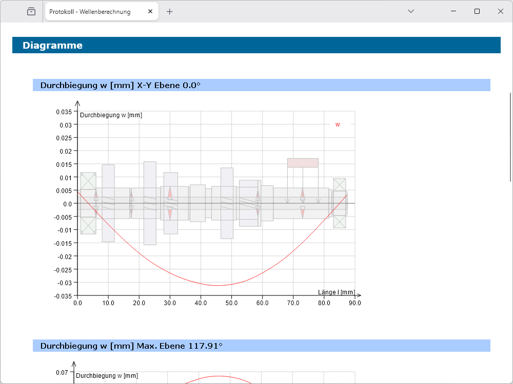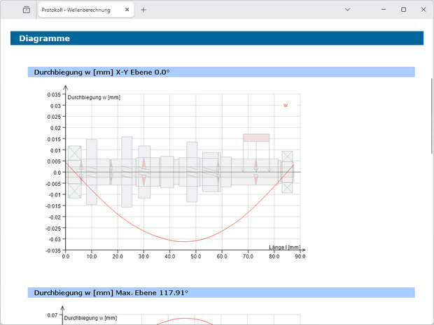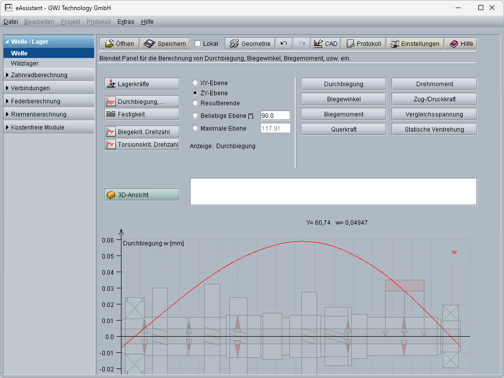 Nach Abschluss der Definition von Wellengeometrie, Lagerung und Belastung können anschließend die Berechnungen ausgeführt werden. Neben der Ermittlung der Lagerkräfte und der statischen Verdrehung, werden die verschiedenen Kraft- und Momentenverläufe bis hin zur Vergleichsspannung grafisch dargestellt. Die Werte für die Durchbiegung etc. an einer beliebigen Wellenposition können mit der Maus direkt aus den Grafiken abgefragt werden.