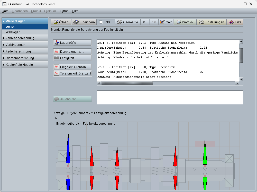 In der Festigkeitsberechnung wird ein kompletter Statischer- und Dauerfestigkeitsnachweis vollständig gemäß DIN 743 durchgeführt. Die erreichten Sicherheiten werden für die einzelnen Querschnitte in einer Grafik farblich dargestellt. Dabei ist für rot gekennzeichnete Querschnitte die Sicherheit unterschritten, für grüne ist die Sicherheit erfüllt und für blau gekennzeichnete Querschnitte ist die erreichte Sicherheit größer als das Dreifache der vorgegebenen Sollsicherheit. Die genauen Werte der Sicherheiten werden in einem Textfenster dargestellt oder können mit der Maus in der Grafik abgerufen werden.