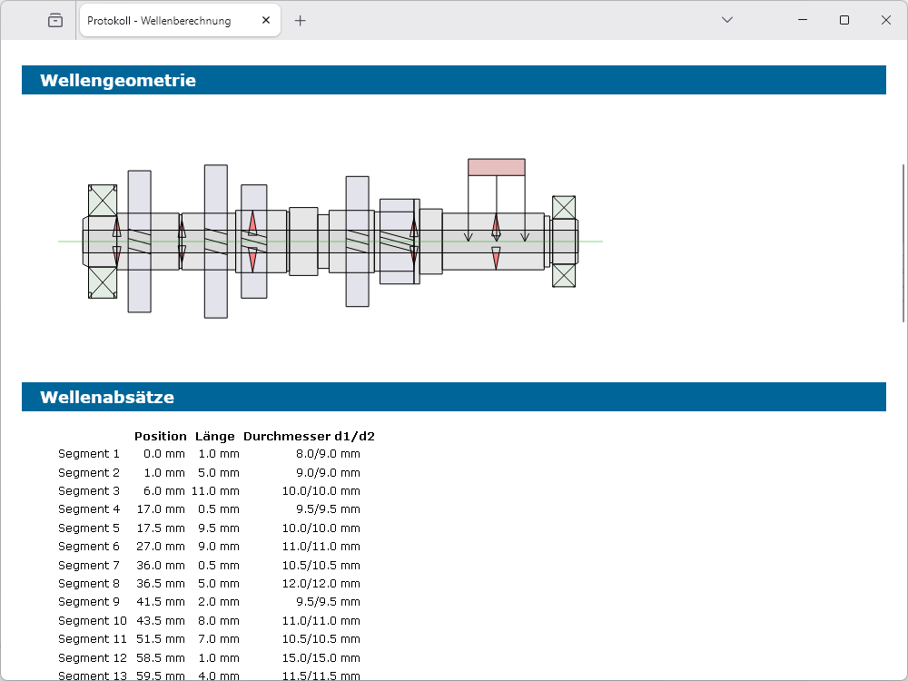 Für die Wellengeometrie stehen beliebig viele zylindrische und konische Voll- und Hohlsegmente zur Verfügung. Zur Lagerung der Welle kann eine beliebige Anzahl von Lagern vorgegeben werden. Somit besteht auch die Möglichkeit der Berechnung von statisch überbestimmten Wellen. Lagersteifigkeit und Druckwinkel sind ebenfalls als Eingabeparameter bei den Lagern verfügbar.