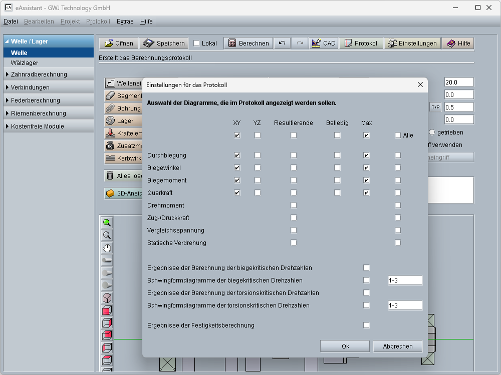 Die Berechnung von biege- und torsionskritischen Drehzahlen ist ebenfalls möglich. Hierbei können optional die Massenträgheitsmomente berücksichtigt werden. Bei den biegekritischen Drehzahlen stehen zusätzlich die Optionen zur Berücksichtigung von Kreiseleffekt und Schubverformung zur Verfügung.