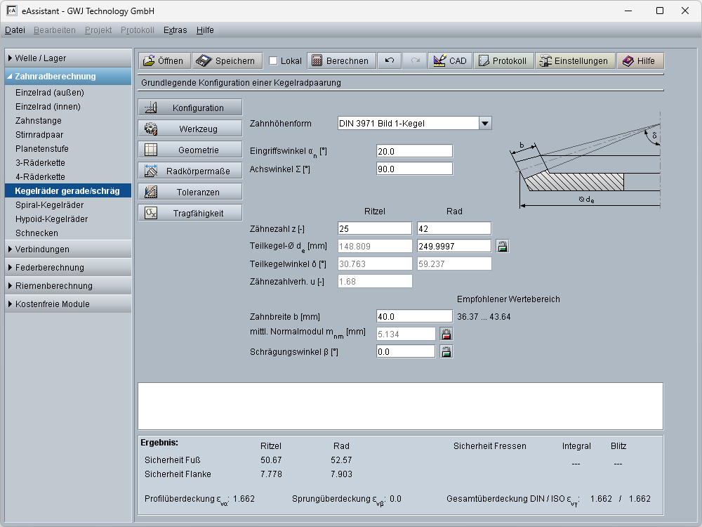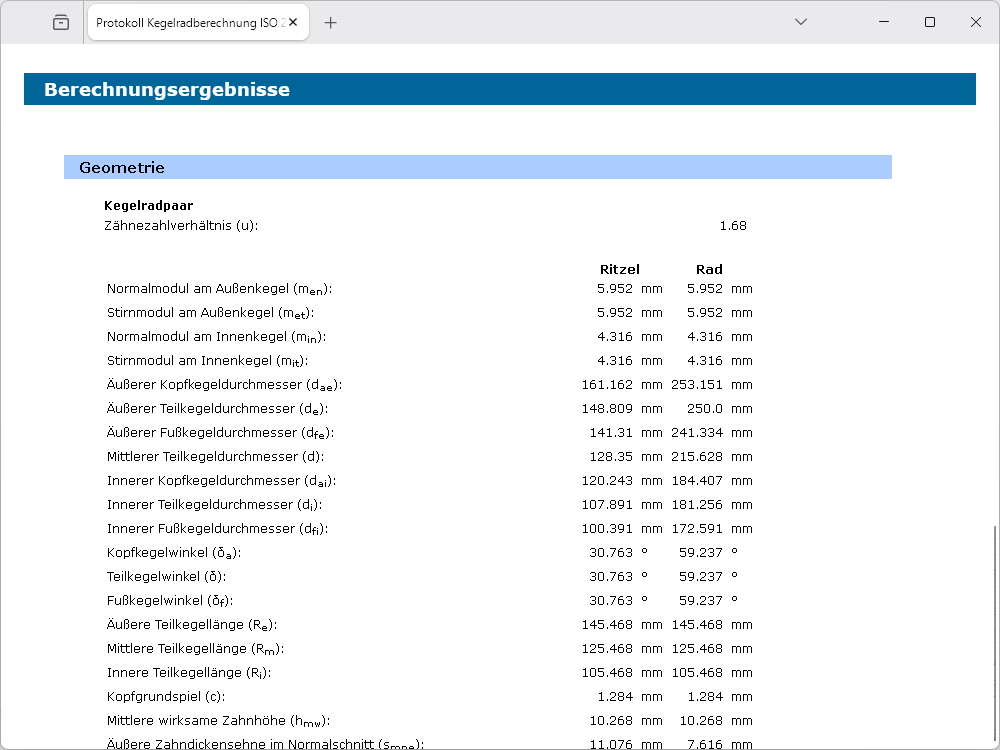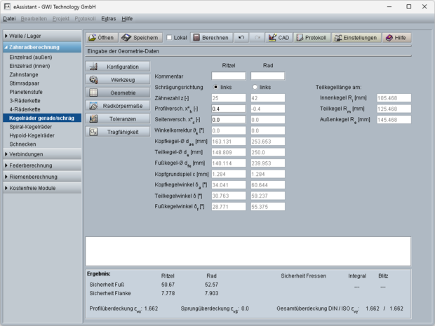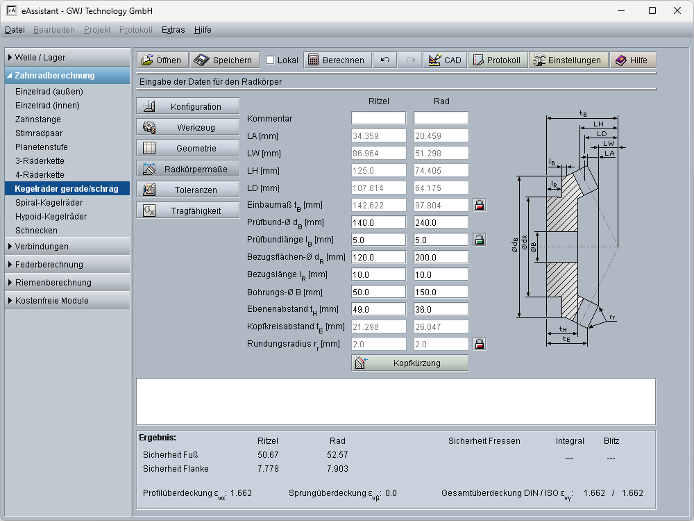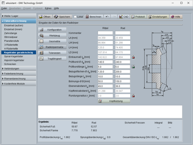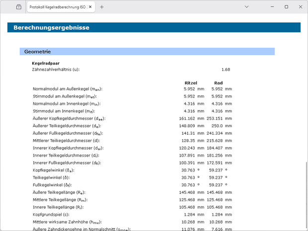 Die Berechnung der Profil-, Sprung- und Gesamtüberdeckung erfolgt gemäß ISO 23509 anhand der Ersatzverzahnung. Weiterhin werden die Drehmaße mit den Kegellängen berechnet. Ergänzend werden weitere Radkörpermaße inklusive Kopfkreisabstand und Einbaumaß ermittelt. Das Einbaumaß kann zusätzlich individuell vorgegeben werden.