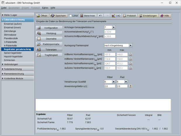 Die Flankenspiele können nach Klingelnberg oder Niemann ausgelegt oder individuell vorgegeben werden. Weiterhin stehen die Toleranzen DIN 3965 für Abweichungen einzelner Bestimmungsgrößen, wie Achsenwinkel- und Achsenschnittpunktsabweichungen zur Auswahl. Die Verzahnungsqualitäten können nach ISO 17485 gewählt werden. Die sich aus der gewählten Verzahnungsqualität ergebenden Toleranzen bzw. zulässige Abweichungen werden ebenfalls mit berechnet. Darüber hinaus werden die Zahnhöhen, Zahndicken und Zahndickensehnen ermittelt.