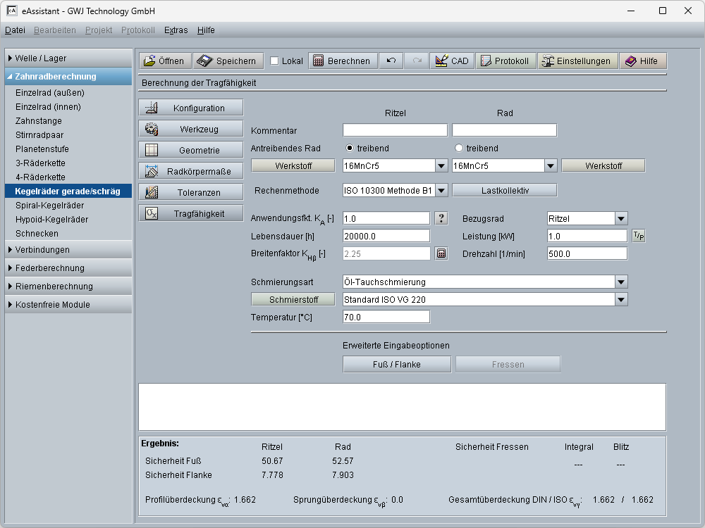- Tragfähigkeitsberechnung nach ISO 10300 Methode B1 mit integrierter Werkstoff- und Schmierstoffdatenbank