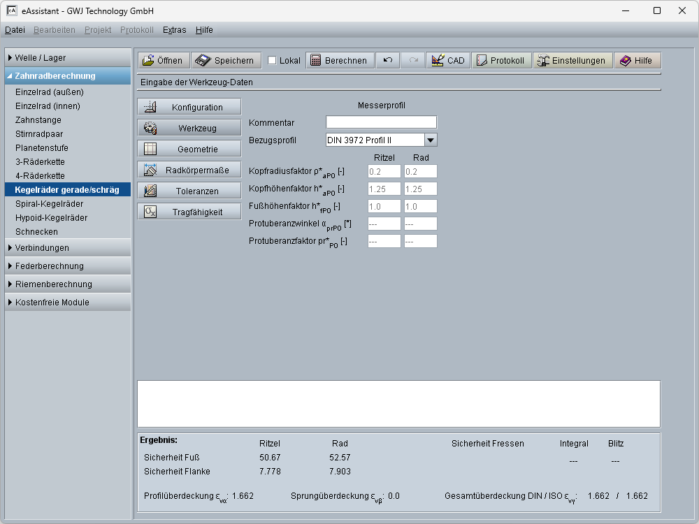 Bei der Auslegung erhält der Anwender Vorschlagswerte für die Zahnbreite. Verschiedene genormte Werkzeugbezugsprofile nach ISO 53, DIN 867 und DIN 3972 stehen für die Berechnung zur Auswahl oder können individuell vorgegeben werden.