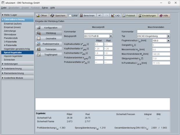 Neben der Geometrieberechnung steht auch die Tragfähigkeitsberechnung nach ISO 10300 Methode B1 zur Verfügung. Hiermit können die Sicherheiten für Zeit- bzw. Dauerfestigkeit sowie für die statische Sicherheit berechnet werden. Es werden die Zahnfuß- sowie Flanken- bzw. Grübchentragfähigkeit ermittelt. Innerhalb der Tragfähigkeits- bzw. Festigkeitsberechnung stehen eine Werkstoff- und Schmierstoffdatenbank zur Verfügung. Zusätzlich kann auch die Betriebsweise, d. h. schwellender, wechselnder oder reversierender Betrieb, mit in der Berechnung berücksichtigt werden.