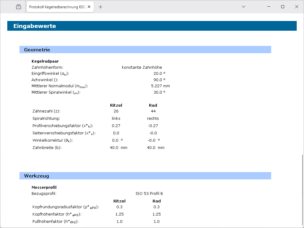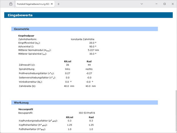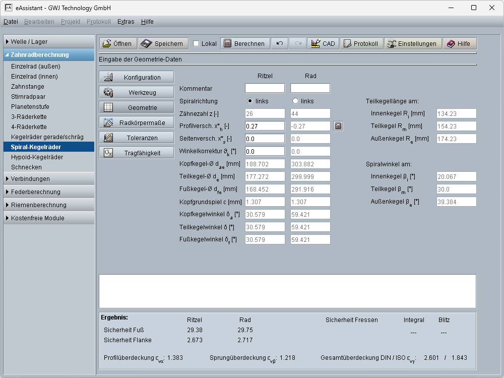 Die Berechnung der Profil-, Sprung- und Gesamtüberdeckung erfolgt gemäß ISO 23509 anhand der Ersatzverzahnung. Weiterhin werden die Drehmaße mit Kegellängen und Spiralwinkeln berechnet. Ergänzend werden weitere Radkörpermaße inklusive Kopfkreisabstand und Einbaumaß ermittelt. Das Einbaumaß kann zusätzlich individuell vorgegeben werden.