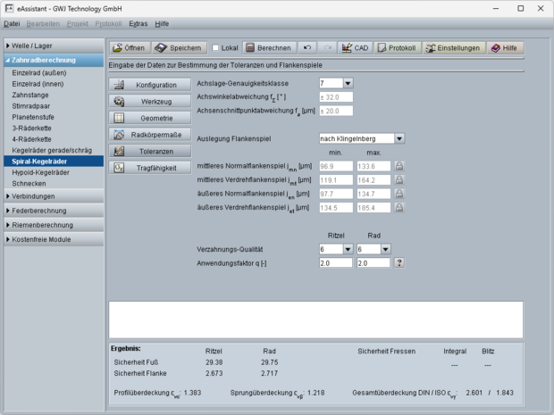 Die Flankenspiele können nach Klingelnberg oder Niemann ausgelegt oder individuell vorgegeben werden. Weiterhin stehen die Toleranzen DIN 3965 für Abweichungen einzelner Bestimmungsgrößen, wie Achsenwinkel- und Achsenschnittpunktsabweichungen zur Auswahl. Die Verzahnungsqualitäten können nach ISO 17485 gewählt werden. Die sich aus der gewählten Verzahnungsqualität ergebenden Toleranzen bzw. zulässige Abweichungen werden ebenfalls mit berechnet. Darüber hinaus werden die Zahnhöhen, Zahndicken und Zahndickensehnen ermittelt.