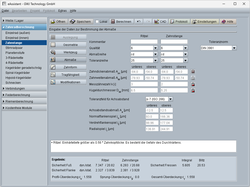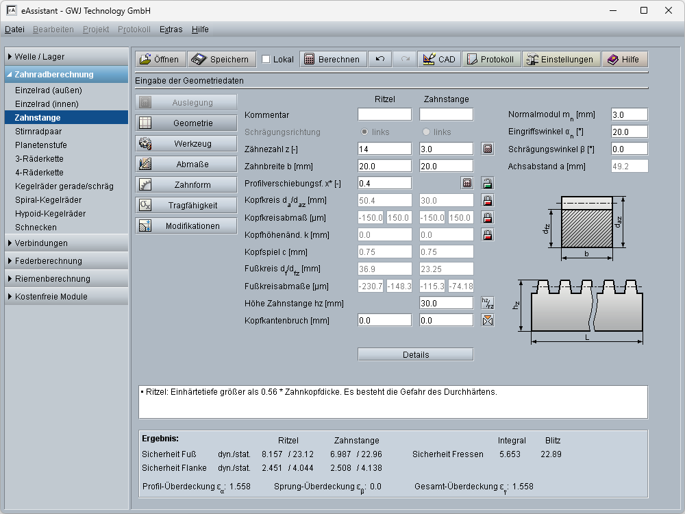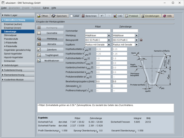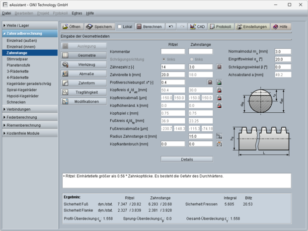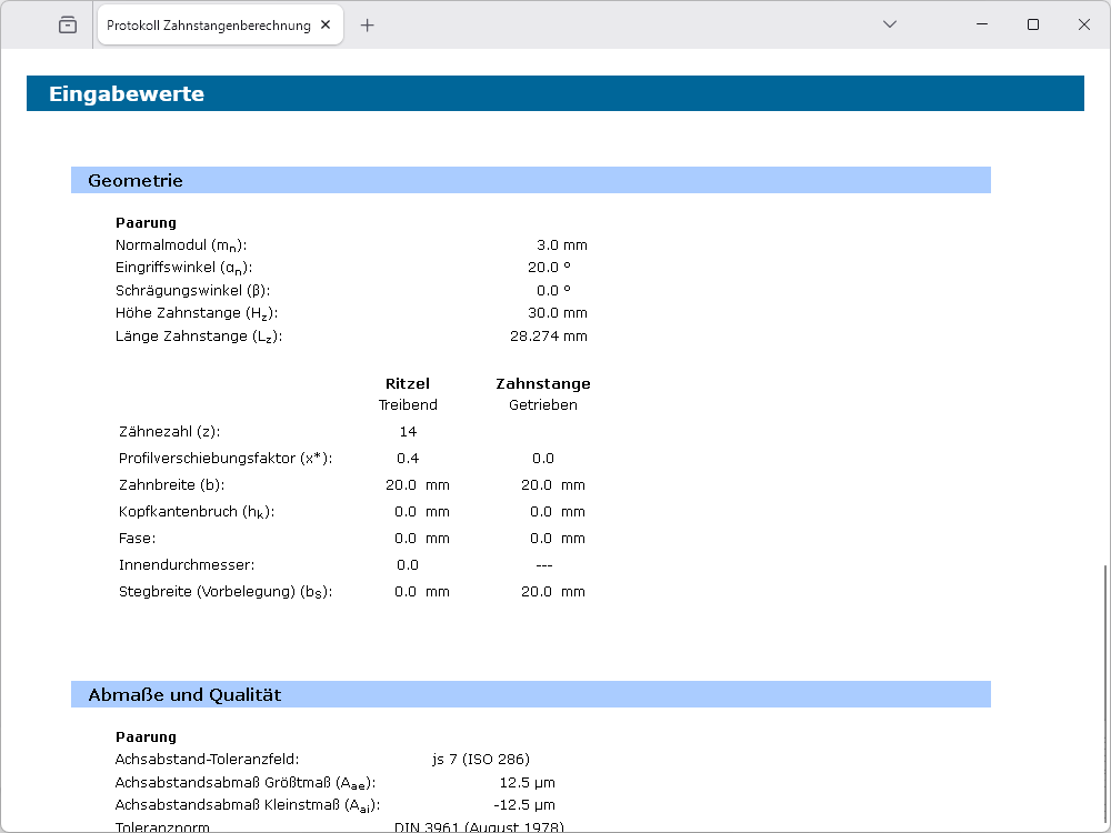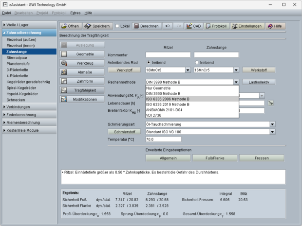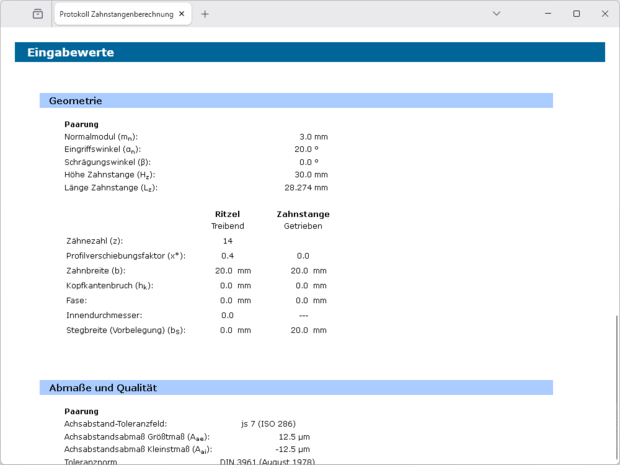 Zahnstange/Ritzel nach DIN 3990, ISO 6336 und weiteren Normen