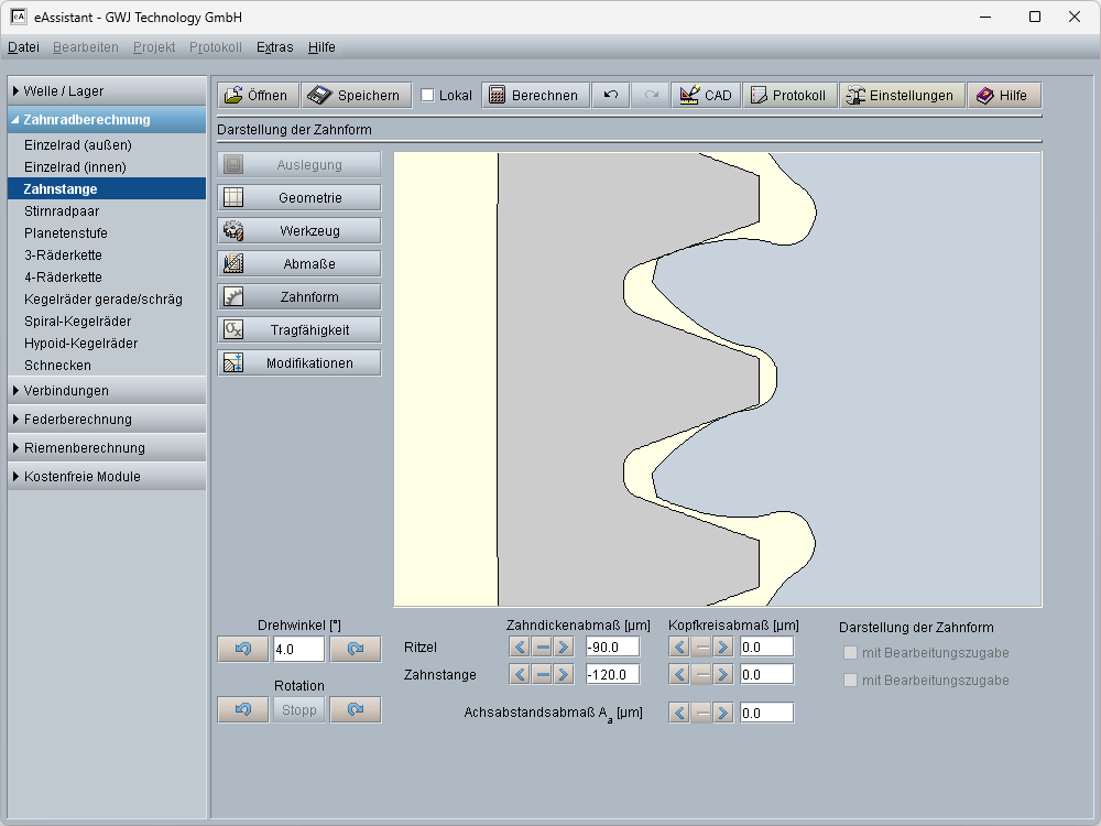 Dieses Zahnradberechnungsmodul ermöglicht die einfache und schnelle Berechnung der Geometrie und Festigkeit von Paarungen Ritzel - Zahnstange. Die Geometrieberechnung erfolgt nach DIN 3960, DIN 3961, DIN 3964, DIN 3967, DIN 3977 und DIN 868. Es werden sowohl Geradverzahnung als auch Schrägverzahnung unterstützt. Bei der Berechnung werden Profilverschiebung, Kopfkantenbruch und Toleranzen berücksichtigt. Verzahnungsqualität, Zahndickentoleranzen und Achsabstandsabmaße können bequem über entsprechende Listboxen ausgewählt werden. Für die Berechnung ist der Betriebsachsabstand vorgebbar oder kann aus der Profilverschiebung ermittelt werden. Verschiedene genormte Werkzeugbezugsprofile nach ISO 53, DIN 867 und DIN 3972 stehen für die Berechnung zur Auswahl oder können individuell vorgegeben werden. Hoch- und Kurzverzahnungen sind ausführbar. Weiterhin werden die Prüfmaße für die Verzahnung ermittelt. Dabei werden die notwendige Messzähnezahl sowie Messkörperdurchmesser automatisch vorgeschlagen. Optional können diese Werte auch durch den Anwender definiert werden. Darüber hinaus ist die Berechnung der Zahndickenabmaße aus den Prüfmaßen rückwärts möglich.