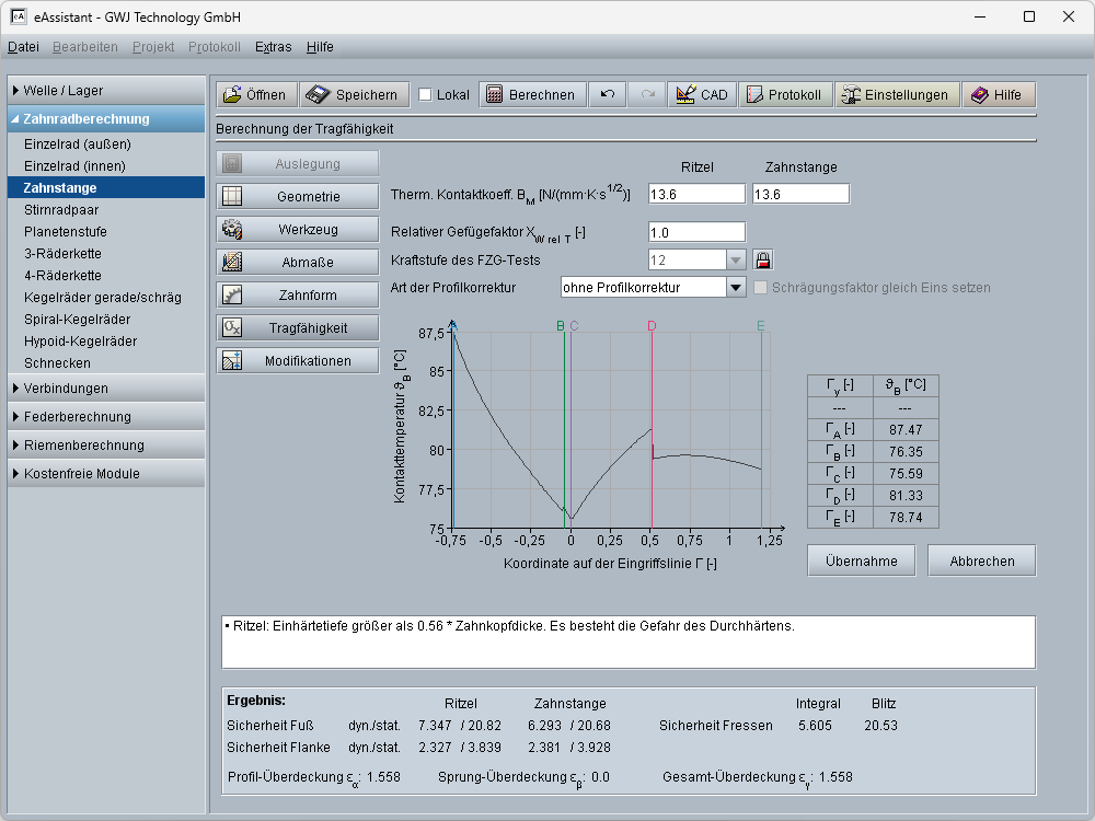 Neben der Geometrieberechnung steht auch die Tragfähigkeitsberechnung nach DIN 3990 Methode B zur Verfügung. Hiermit können die Sicherheiten für Zeit- bzw. Dauerfestigkeit sowie für die statische Sicherheit berechnet werden. Es werden die Zahnfuß- sowie Flanken- bzw. Grübchentragfähigkeit und die Fresstragfähigkeit nach dem Integral- und Blitztemperaturkriterium ermittelt. Der Verlauf der Kontakttemperatur über den Zahneingriff wird grafisch dargestellt.