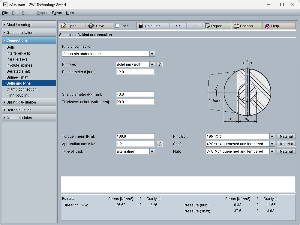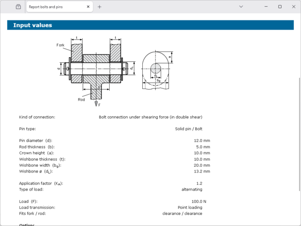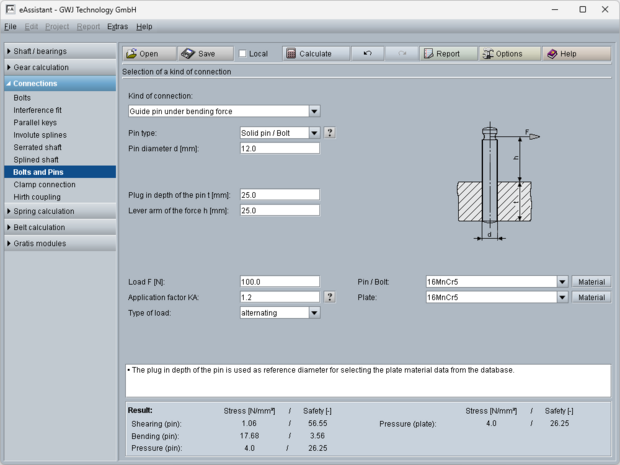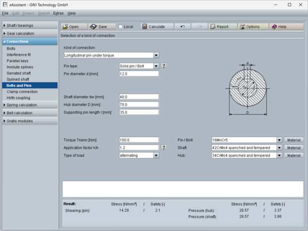 All calculations are based on generally accepted literature (e.g., Niemann and Decker). Futhermore, different pin types are available for the calculation: solid pin/bolt, grooved pin, (hollow) dowel pin as well as coiled spring pin.