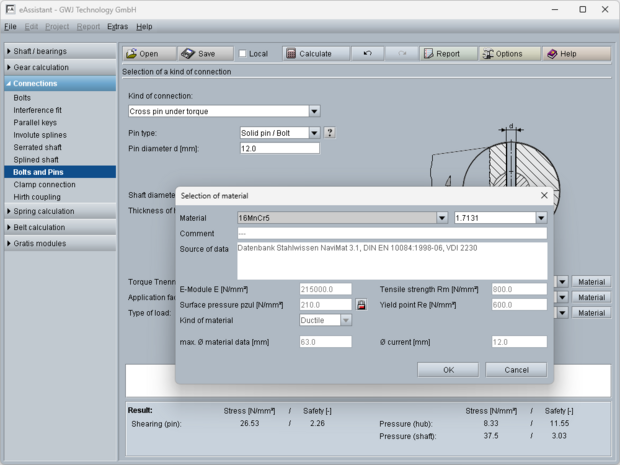 An extensive material database is available. The user can manually enter material properties. There, the E-Module, tensile strength, kind of material and yield point can be defined. The permissible surface pressures are determined from yield point and tensile strength and can be defined manually.