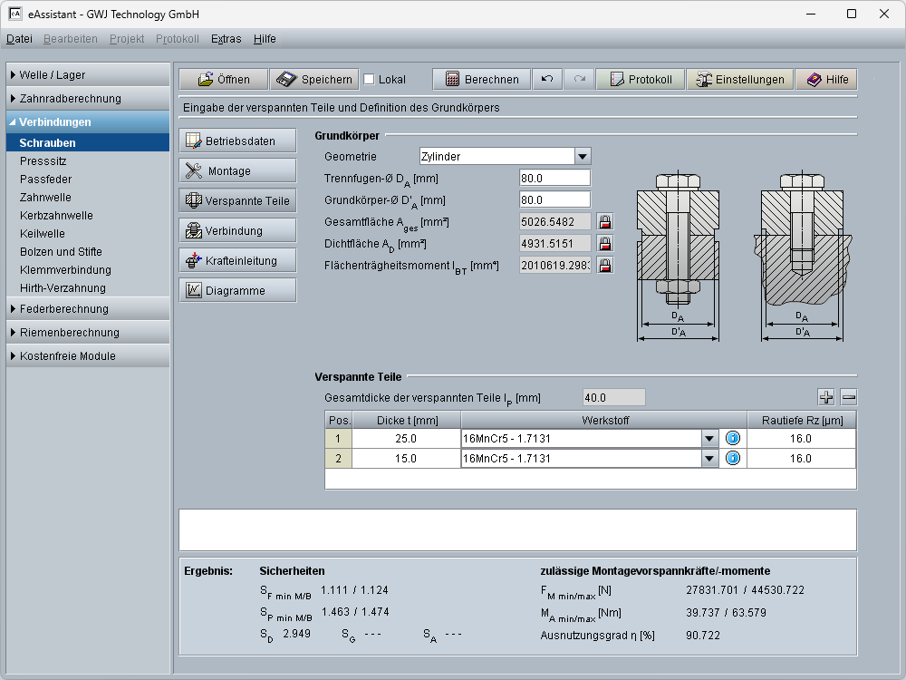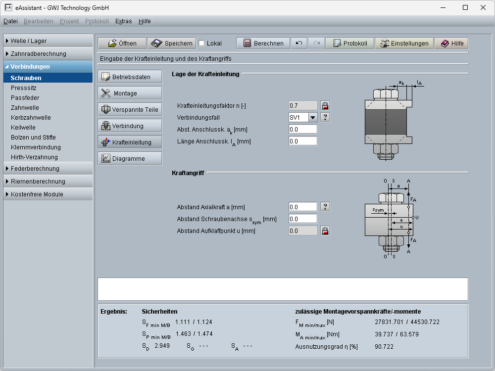 - Schraubenberechnung mit eAssistant: Unterstützte Aufbauvarianten, Betriebsdaten, Montage, verspannte Teile, Verbindung, Auslegung, Vorschlag für Schraubengröße, Krafteinleitung